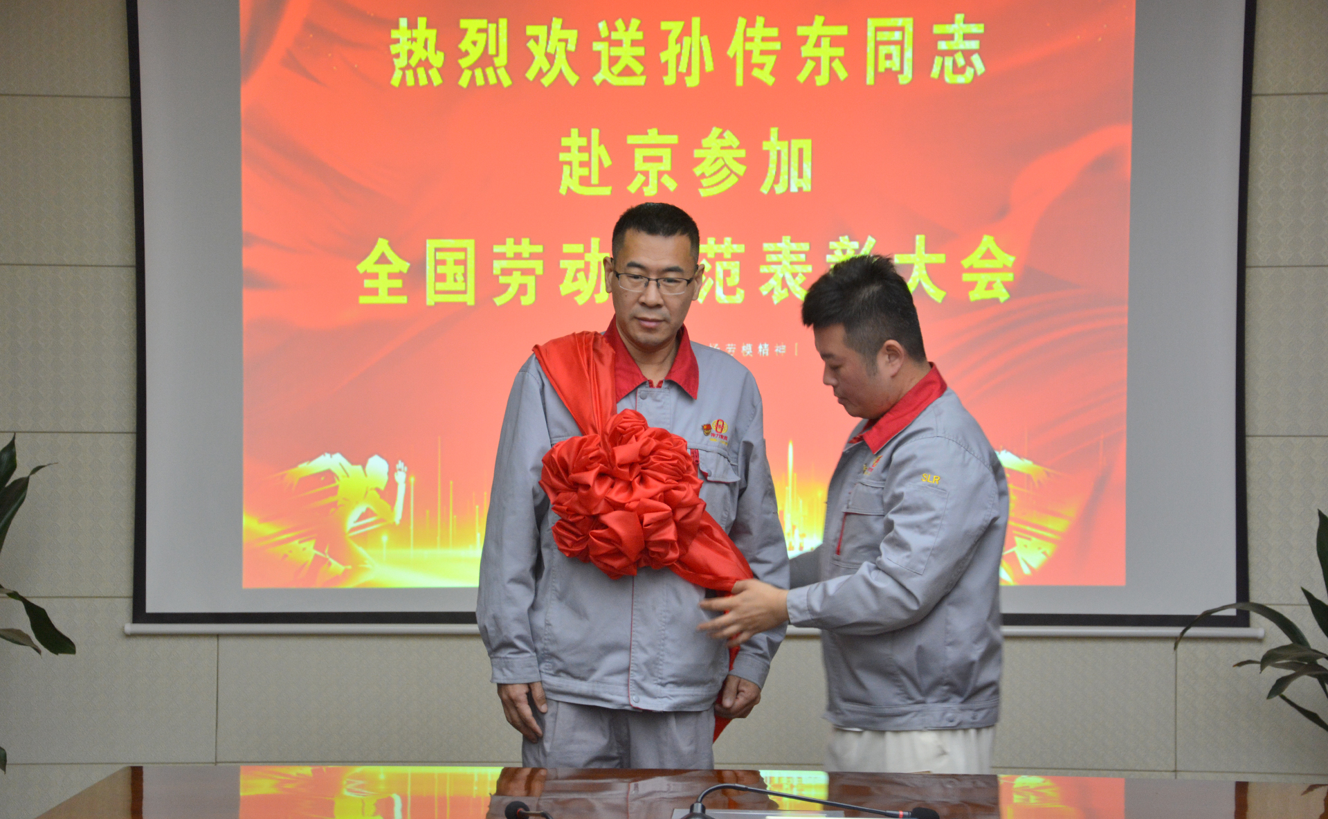 在參會(huì)人員熱烈的掌聲中,公司董事長兼總經(jīng)理杜大平為孫傳東同志佩戴大紅花,并獻(xiàn)上鮮花。董事長為其榮獲“全國勞模”的殊榮表示熱烈祝賀,向他愛崗敬業(yè)追求卓越勇攀高峰的工匠精神表示敬意!